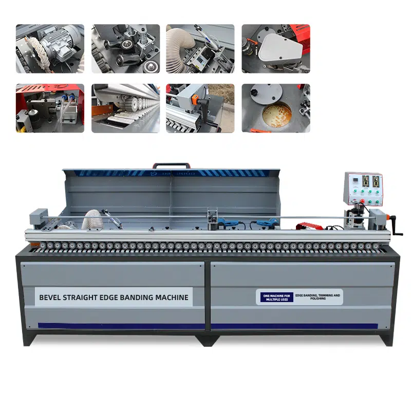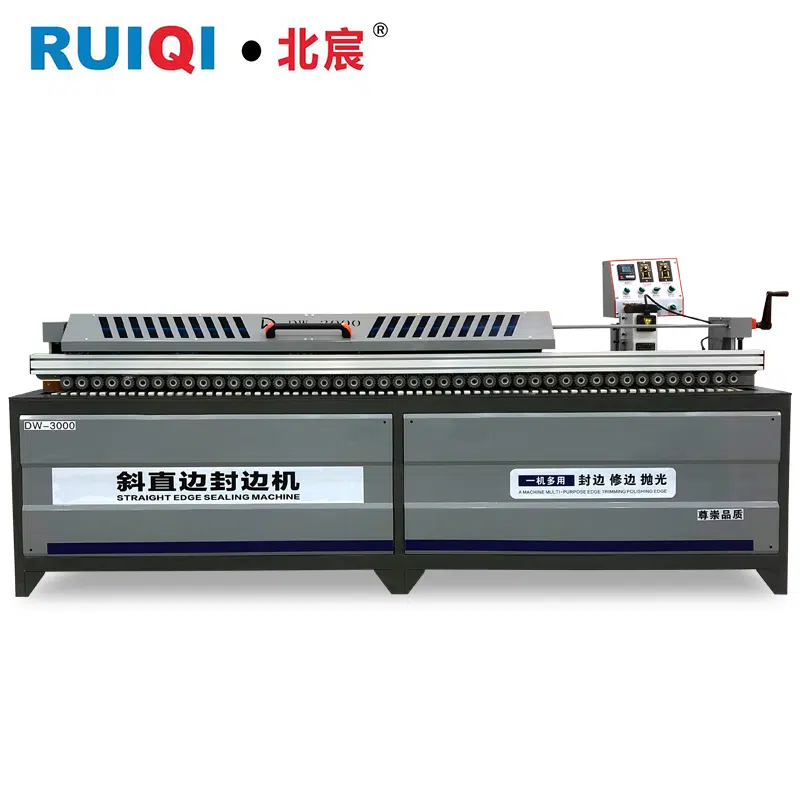 The Straight Bevel Edge banding machine with Large-scale gluing bearing, edge band slotting device, slotting height can be adjusted, edge banding is more compliant, double cylinder feeding belt is more stable and not shaking, double heat gun design, heating edge banding is more obedient, 8 groups The angle of the oblique pressure wheel can be adjusted arbitrarily from 30 to 90. The 800W silent trimming motor, the industrial-grade polishing motor and the vacuuming motor are polished smoothly and cleanly. The DW3000 trimming motor is replaced with a spindle trimming motor, with a total of 3 spindle motors. With a flexible edge scraper to clean the glue line, the finish is better