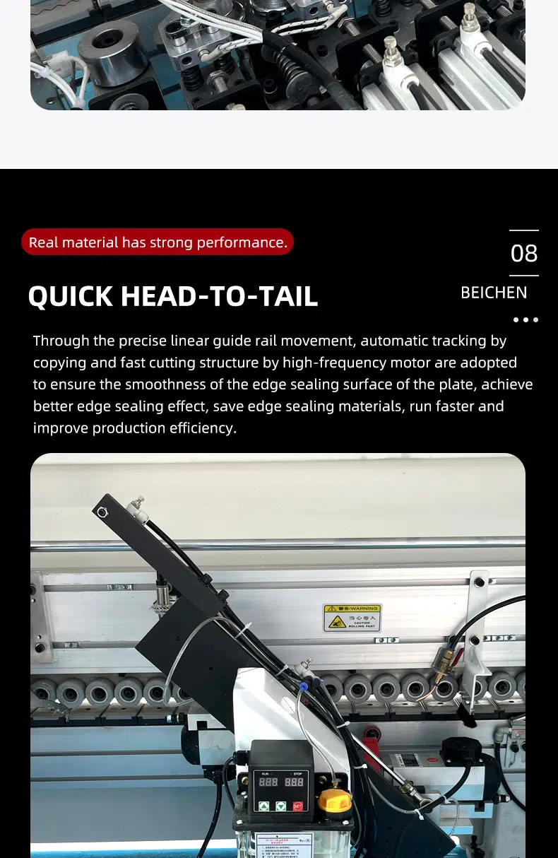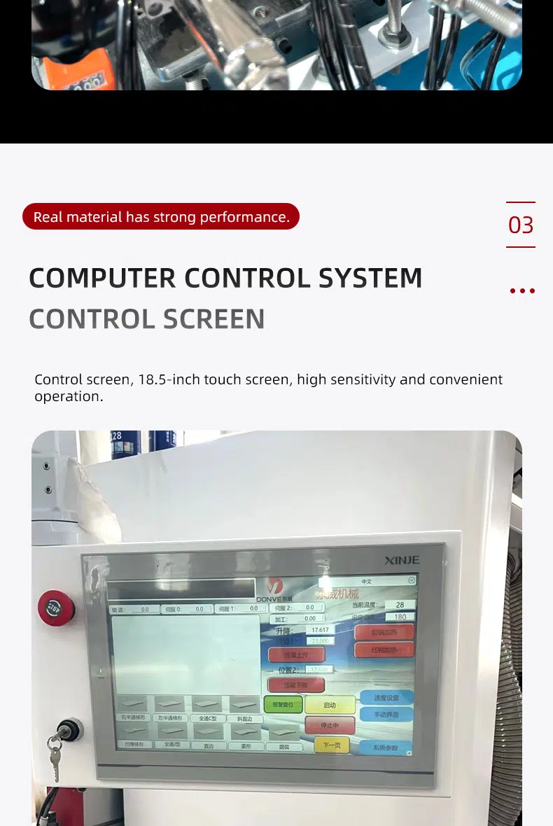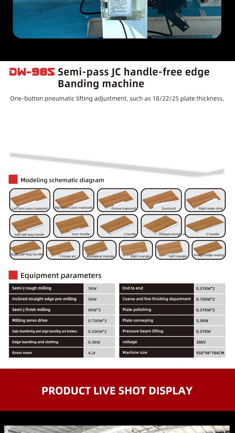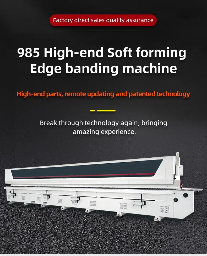 DW985 Soft forming edge banding machine is a fully automaticsemi-automatic edge banding machine without handle.the wheeled profiling design system supports remote upgrading of more shapesand the touch screen operation key switches different shapes, and the maximumprocessing speed can reach 8-12m/min.all parts are made of high-end brands and well assembled. ensure that theequipment runs stably and can adapt to different high and low temperatureenvironments. the equipment has the characteristics of high stability, accurateprocessing, high efficiency and simple operation.